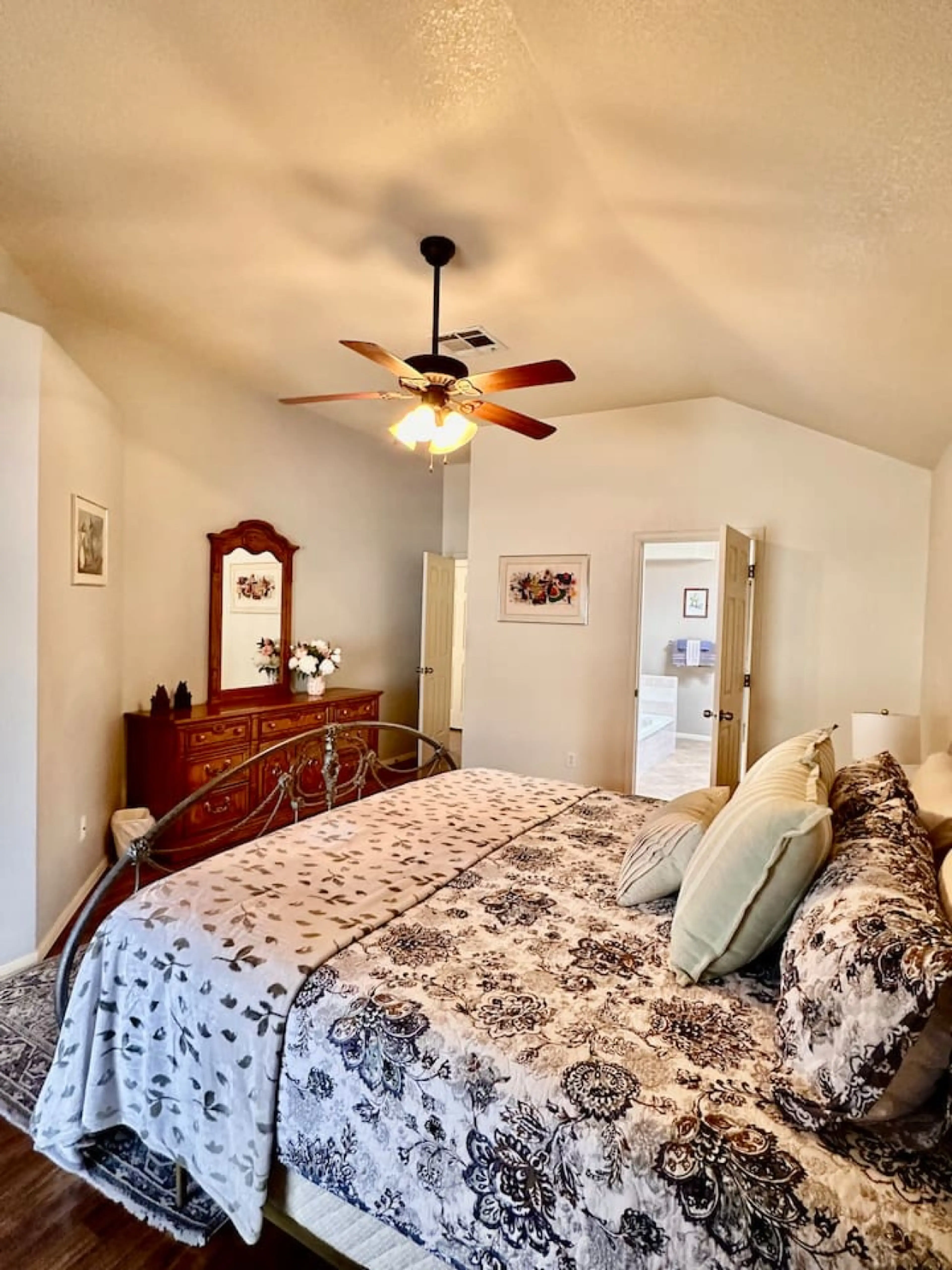 I stayed here for a medical procedure and it was perfect—clean, well maintained, and stocked with thoughtful touches like eggs, butter, and English muffins. It smelled fresh and welcoming, and the furniture was very comfortable. The bedding was luxurious, though I used my own and covered the furniture to protect it from my dog’s hair. The yard was secure for dogs, though small ones might slip through the gate—I brought a baby gate just in case. The master bedroom opened to a patio, which made dog access easy, and the garage opener was super convenient. The neighborhood felt safe and peaceful, and the location was ideal—right next to medical complexes and close enough to the freeway that you could see and hear it from outside. The only hiccup was that the VRBO app didn’t provide check-in instructions and messages weren’t going through, but calling the host got an immediate and helpful response. I’d absolutely stay here again and recommend it to anyone looking for a clean, comfortable, pet-friendly place in Las Cruces.